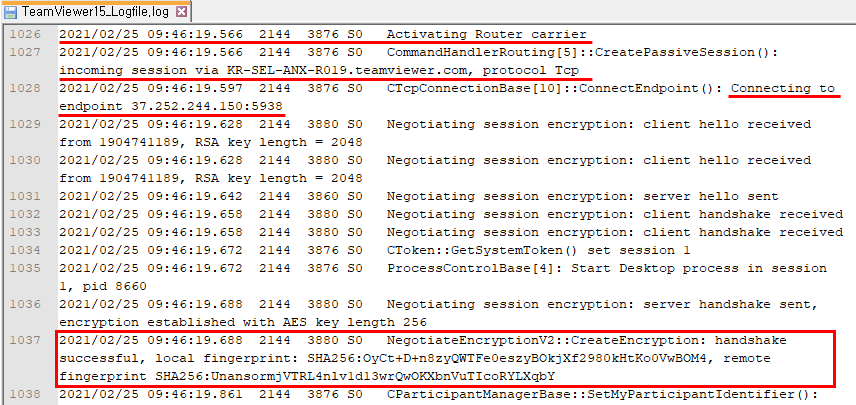 원격 세션이 시작될 때 로그는 Activating Router carrier 문구로 시작된다. 그리고 팀뷰어 중개서버를 연결하고 노드 간 암호화 통신을 위한 RSA 키 협상 절차가 진행된다. 실제 A와 B는 AES-256 대칭키로 암호화 통신을 한다. 더 자세한 내용은 여기에서 확인할 수 있다.