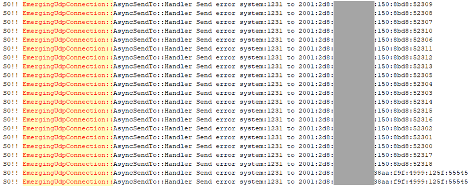 - EmergingUdpConnection::AsyncSendTo::Handler Send error system:1231 to Public IPv6:port
