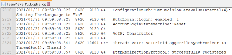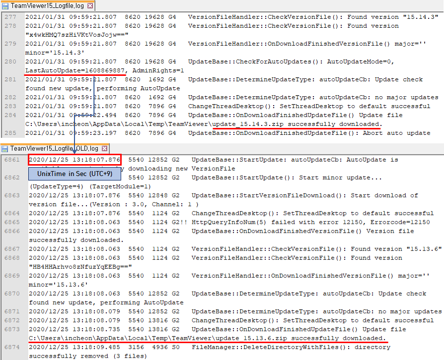 ‘TeamViewer##_Logfile.log’ 로그 역시 시간을 기록하는데 시간은 로컬 타임으로 보정되어 로그가 기록된다. 즉 우리나라의 경우 시스템 시간에 맞게 UTC+9로 기록이 된다. 해당 로그는 동일한 이름으로 2개가 존재하는데 로그의 내용도 다르고 저장되는 경로도 다르다.