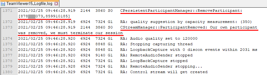 원격 세션 종료 시 ‘RemoveParticipants’ 키워드의 로그를 시작으로 관련 서비스, 쓰레드를 종료하는 로그가 남는다.