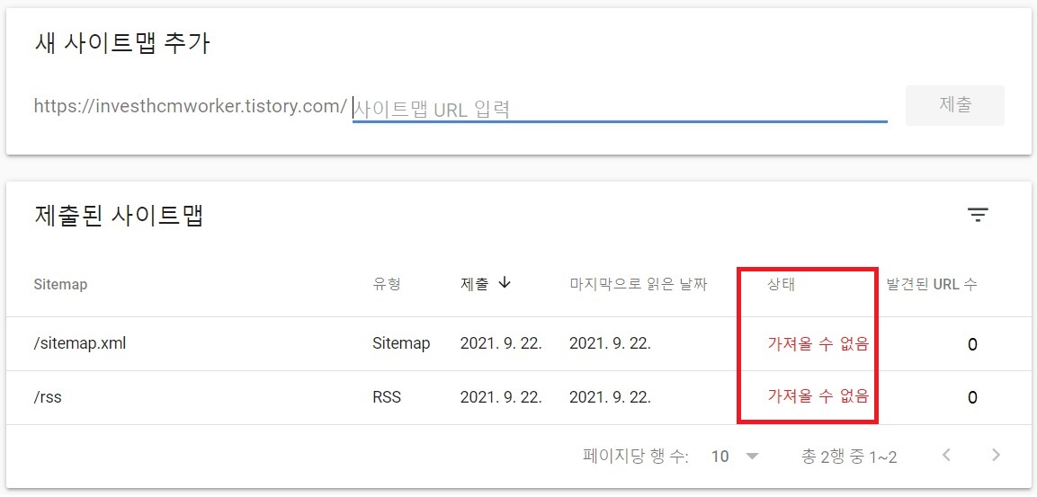 아직도 사이트맵이 "가져올 수 없음" 상태일 것입니다.