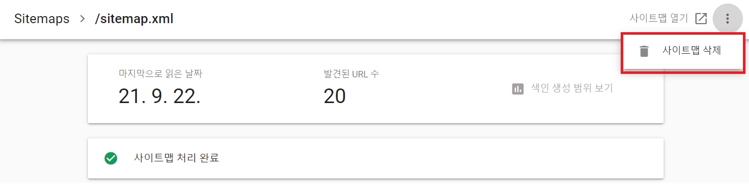 해당 방법으로 제출된 사이트맵 2개를 모두 지워줍니다.