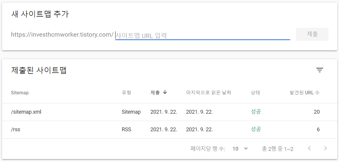 10. 사이트맵 URL 입력 칸에 sitemap.xml과 rss를 입력 후 제출 버튼을 누릅니다.