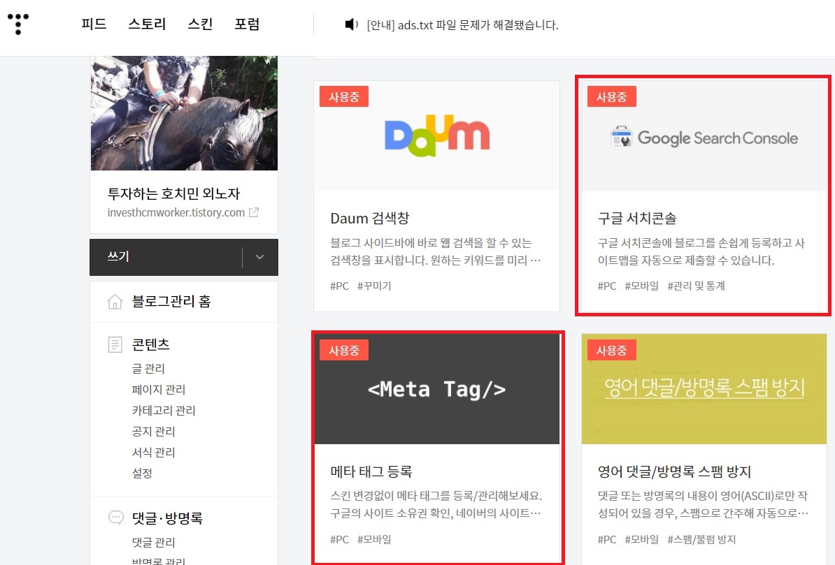 5. 블로그의 플러그인에서 "구글 서치 콘솔"과 "메타 태그 등록"을 사용 중으로 바꾸고 하루 뒤에 구글 서치 콘솔에 접속합니다(바로 적용되지 않으므로 하루 뒤가 아니더라도 시간 여유를 가지고 해야 하는 것으로 보입니다).