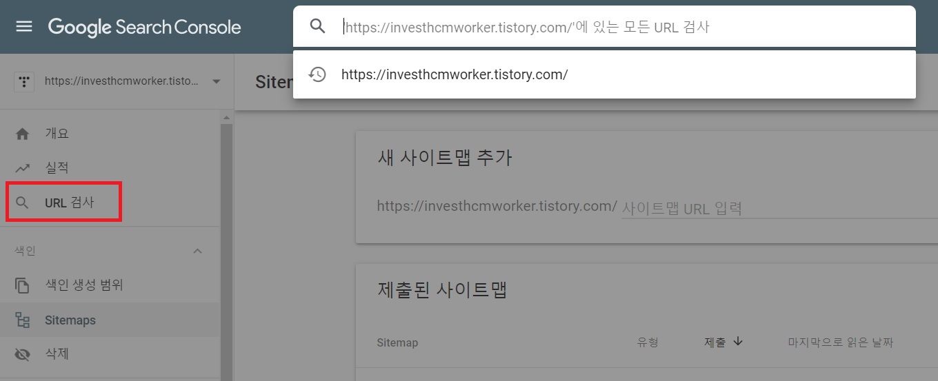 다시 구글 서치 콘솔에 접속하여 URL 검사를 눌러 블로그 주소를 입력합니다.
